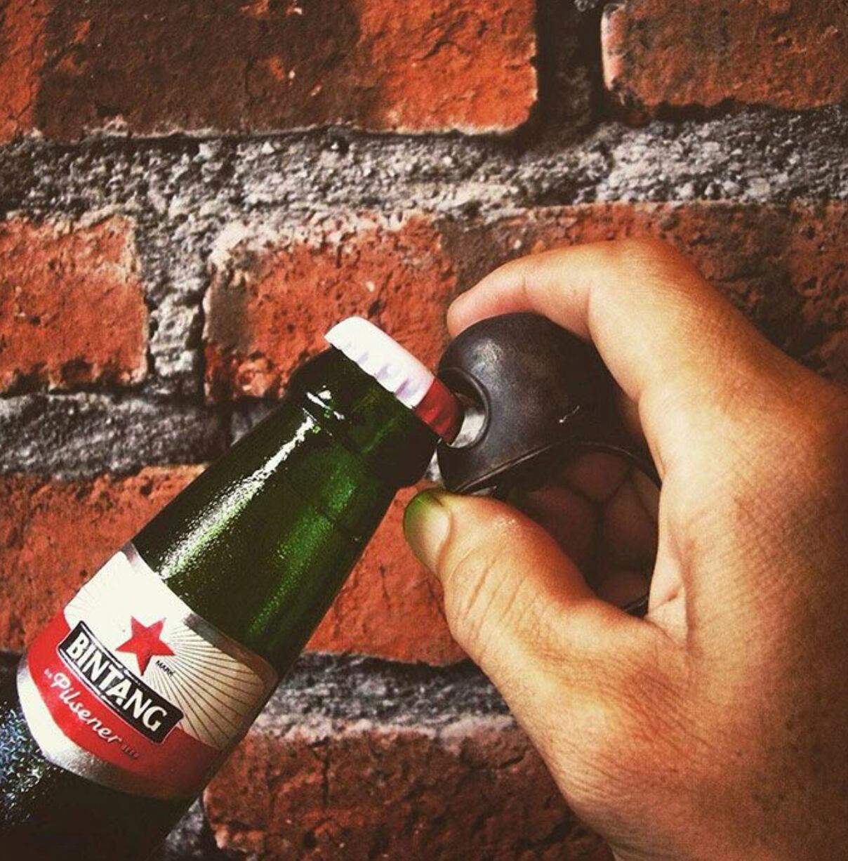 ヘルメット部分がボトルビール等の栓抜きになります。バイクキーの他にも多くの鍵を取り付けられる25mmのキーリング付きです。