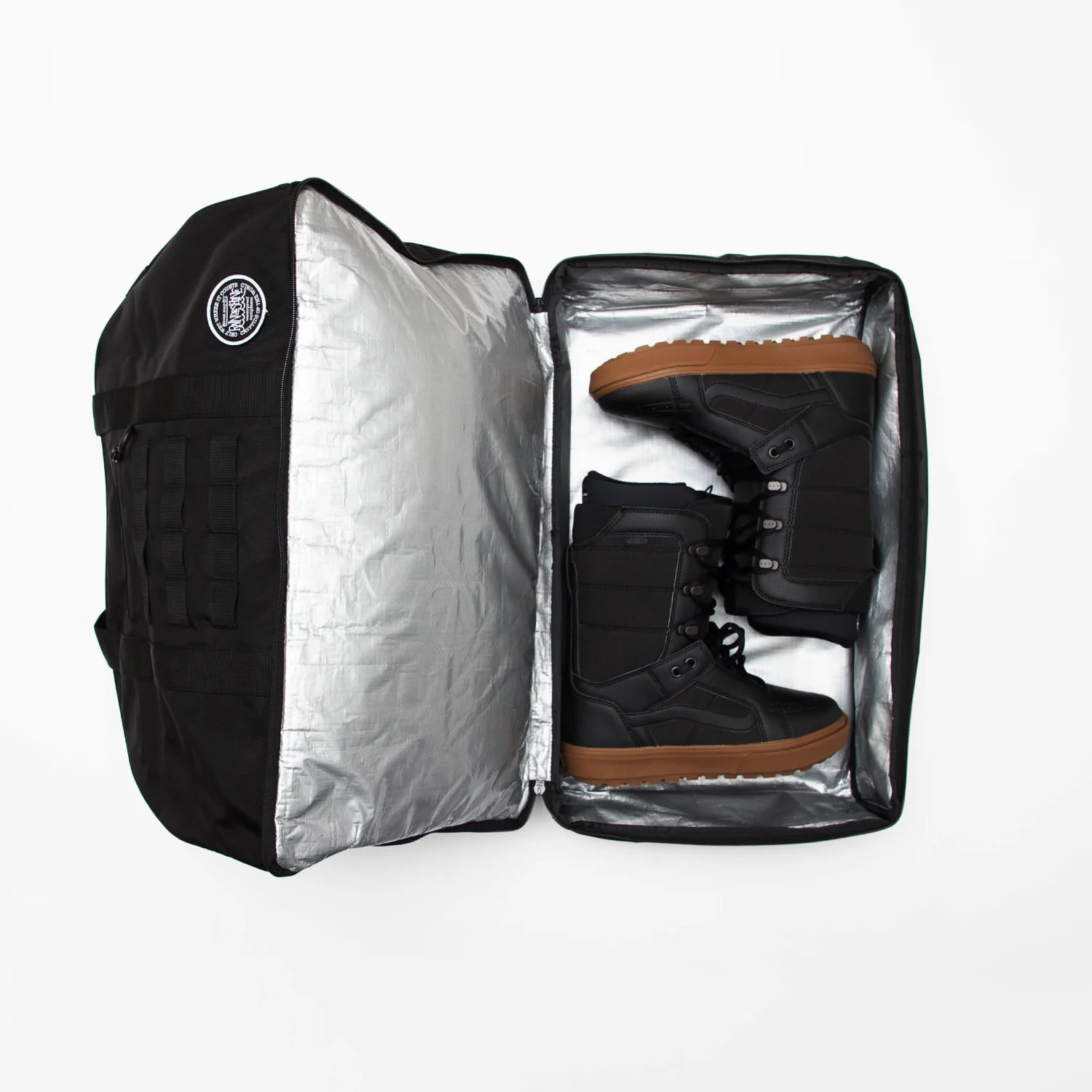 トリップに欠かせない大容量バッグ。上部メインコンパートメントは出し入れしやすいラウンドファスナーでアクセス。下部にはスノーボードブーツから汚れ物、濡れた衣類などを収納できるようにPVCターポリン素材を採用。