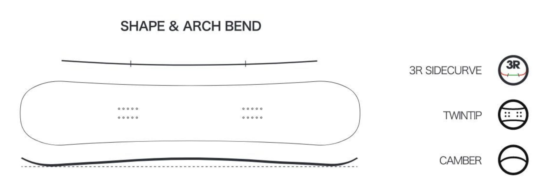 また、3Rサイドカーブが配置されたシェイプは荷重時に効率的なボードのたわみを生み出し、ツインチップながら安定したターン性能を実現。