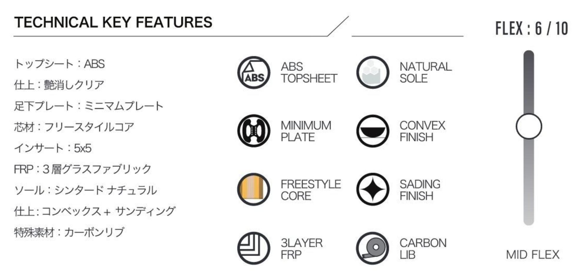 高反発グラスやスタンス間に配置されたカーボンリブにより瞬発性に優れ、ジャンプの高さを出しやすく、グラブ時のボードの引きつけも容易です。