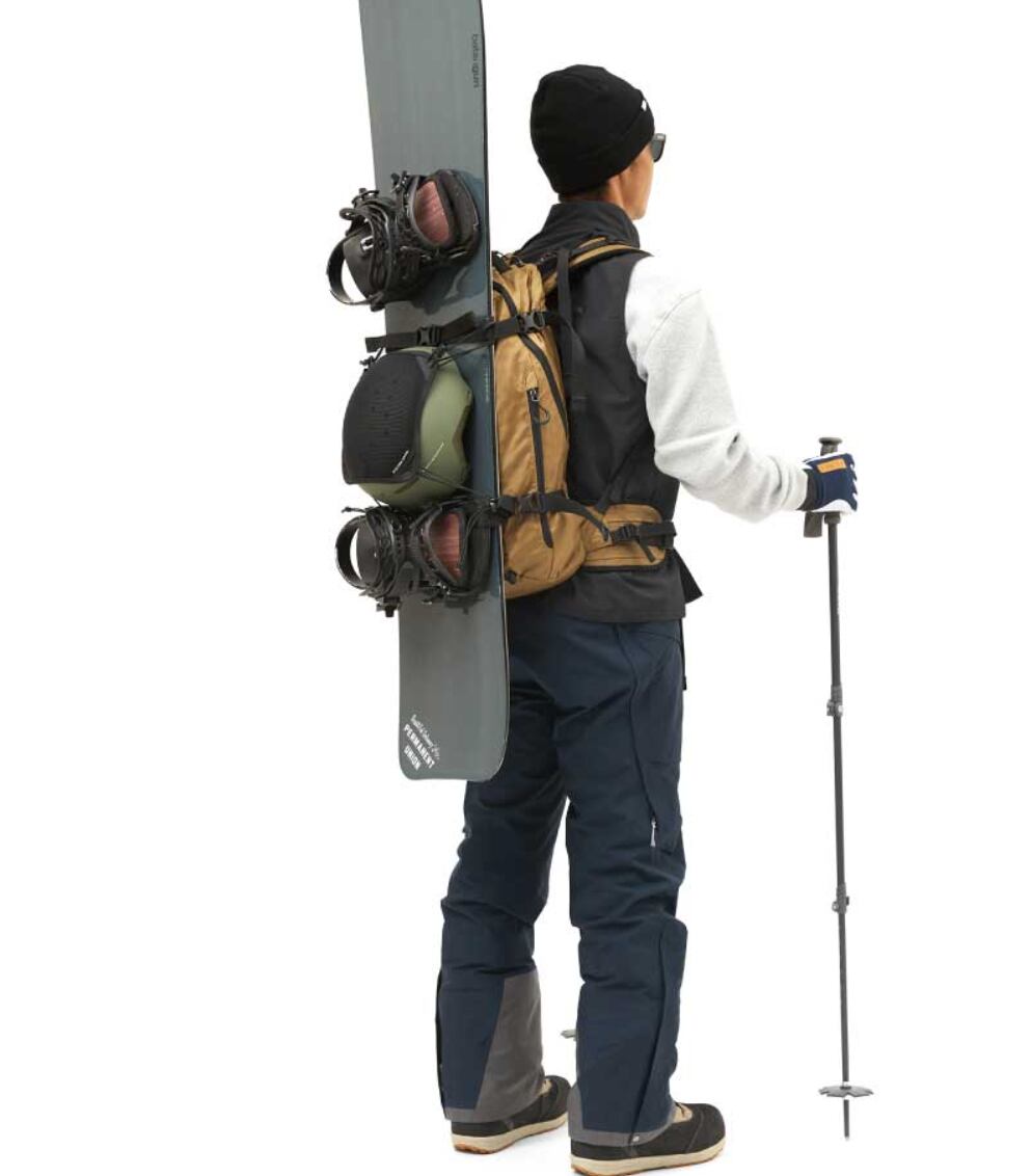 100%リサイクルポリエステル素材ECOPAKの生地を採用し軽量化を実現。しっかりとしたホールド感は健在で、滑るために体力を残し登坂するために必要な道具をテーマに開発を行いました。背面パネルはSHUMARI35EVOと同様、独立式3面パッドを採用。独自に企画開発を行った背面パッドは背骨を中心にそのサイドを固定し安定させる構造になっており、特にたくさんの荷物を入れた状態で起こりやすいバック自体が球体になるのを背面パッドで平面に抑える事で背中へのフィット感を維持させています。日本人の体型に合わせて設計された3DSショルダー ストラップと3DETPフレームは荷物の重量と滑走時の運動の妨げを軽減し、CSウエスト ハーネスは動きを妨げる事がないような柔らかさがありながら骨盤を包み込む様なフィット感で荷物の横揺れを防止します。ギアラックのアクセスはザックトップからのアクセス。荷室とアバランチギアを同じ開口部よりアクセス可能で、25Lサイズを必要とするシーンで持ち合わせる装備品をしっかり収納可能とした。無駄を省き、シンプルな構造にすることにより迷いなく直感的な出し入れが可能となっている。ピッケルはザック下部から収納可能。またシールを収納する事で、登坂と滑走の入れ替えの際に手際よく交換可能です。荷室上部にはゴーグルポケットや細かな装備品を。すぐに出したい小物はバック上部取手の部分のポケットも活用できる。サイドのポケットには大きな水筒も入る。メインバックルはNifco製ウィンターバックルを採用しグローブをしたままでも取り外しがしやすく、雪が入りにくい構造になっている。ショルダー、ウエストハーネス部分は破損が多い箇所なのでウィンターバックルではなくNifcoのバックルの中でも構造的に強度が高いバックルを使用。もしもの際、緊急用でツェルトを携帯することをお勧めします。ツェルトがあればピッケル、シールを入れるザック下部にあるファスナーを開け奥にあるテープにツェルトを付けれることで暴風で身を守る際ツェルトが飛ばないように使用可能です。MAKIRI25EVOにはアタッチメントできるポーチなどがオプションで設定され、使用者の好みによってカスタマイズ可能です。