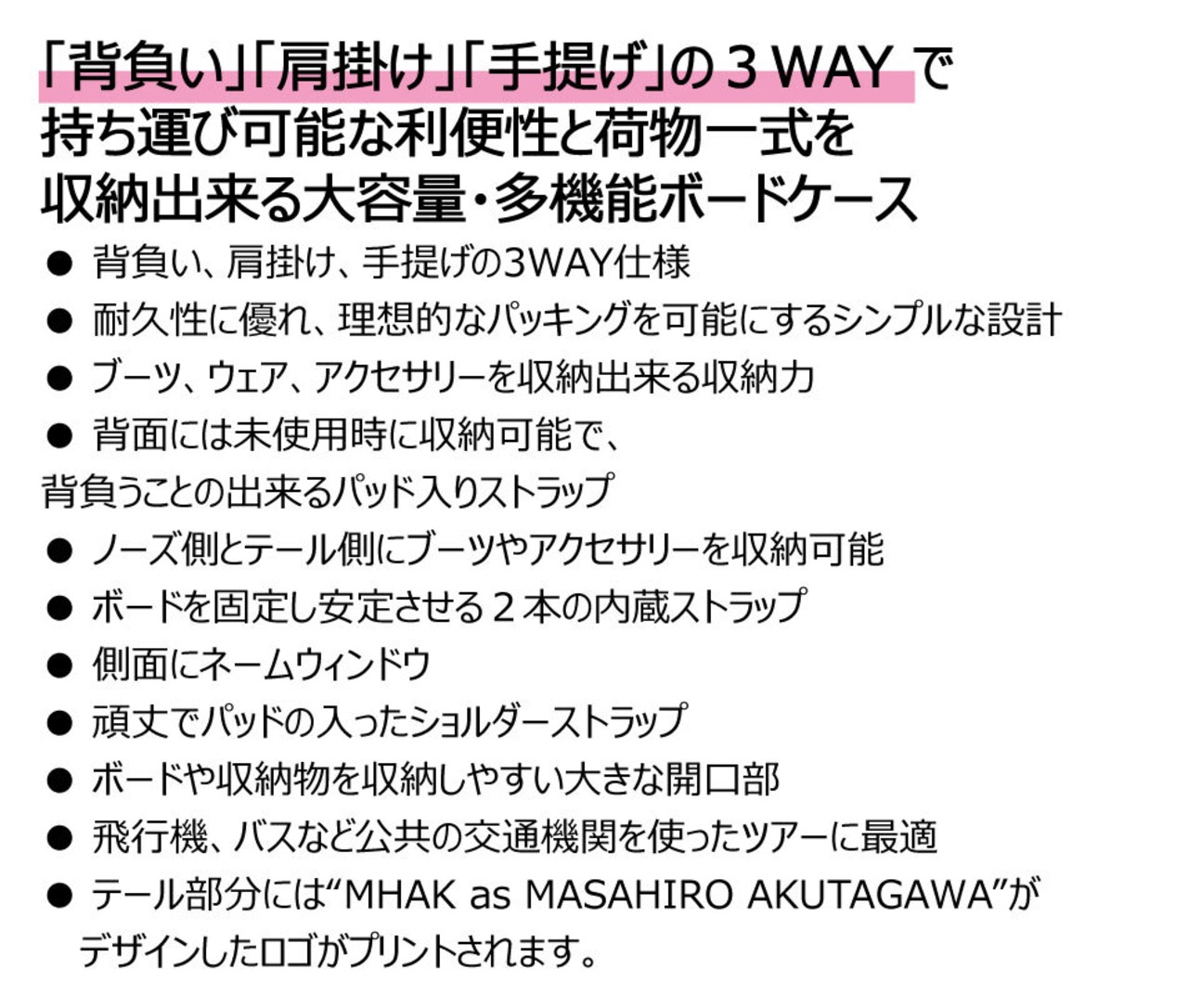 ・ 背負い、肩掛け、手提げの3WAY仕様 ダブルジップで使い易いノーズ側とテール側のブーツ収納ポケット (Shuttle roller board bagと共通機能)